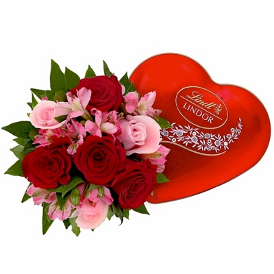 Um kit delicado e perfeito para presentear alguém especial! Sendo uma ótima opção para diferentes ocasiões, ele é composto por uma lata enfeitada em forma de coração que contém os deliciosos bombons suíços da Lindt 42g e um arranjo de Rosas Vermelhas e Rosas em conjunto com belas Astromélias Rosas.