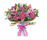 Composto com 12 gérberas de até 3 cores de acordo com o estoque, acompanhado de folhagens diversas.